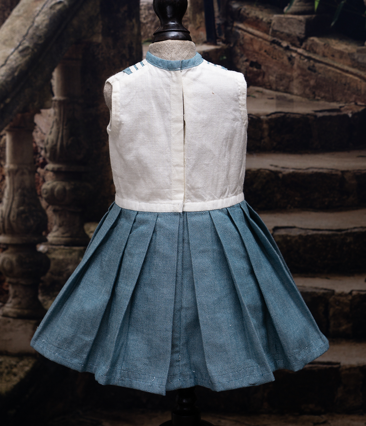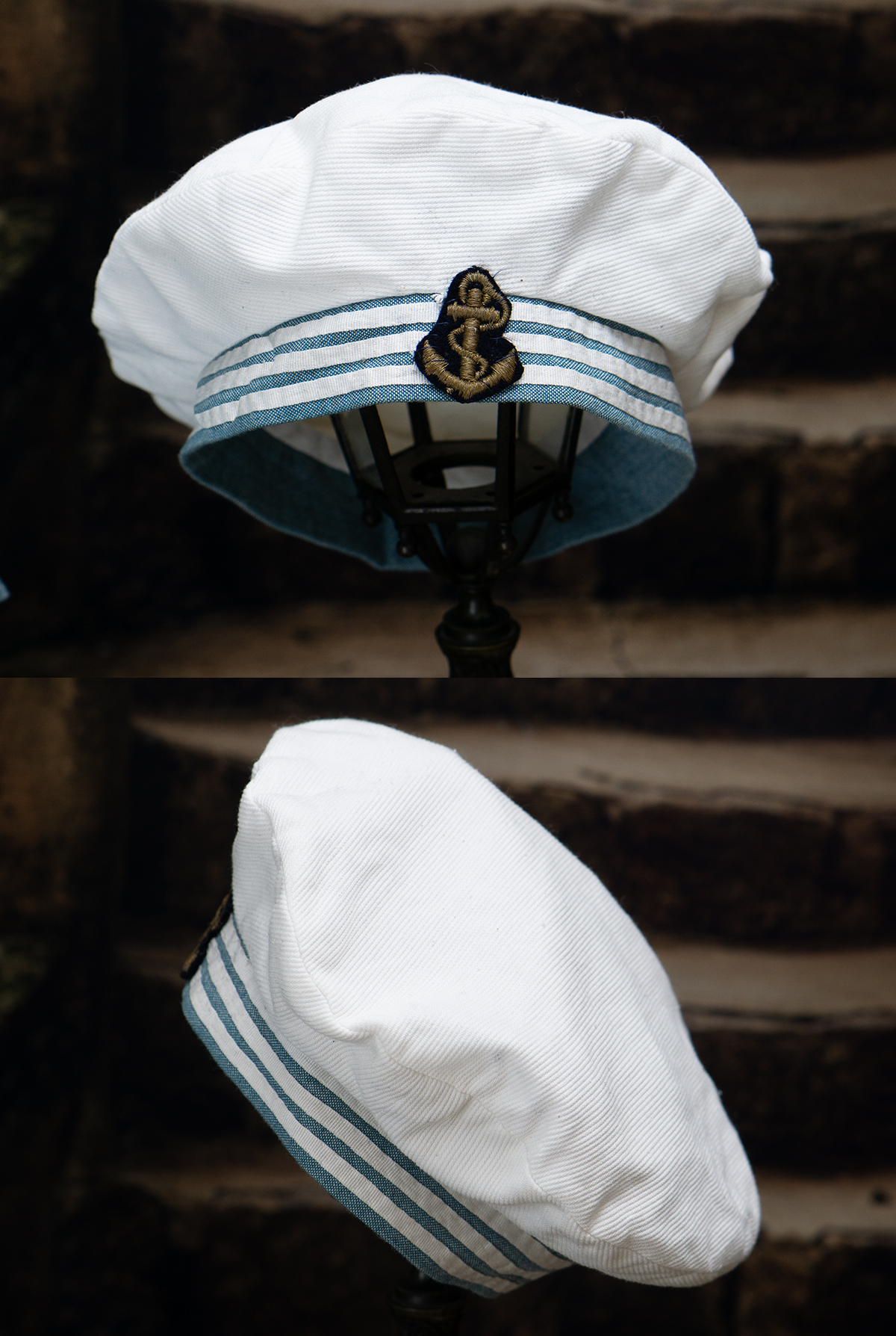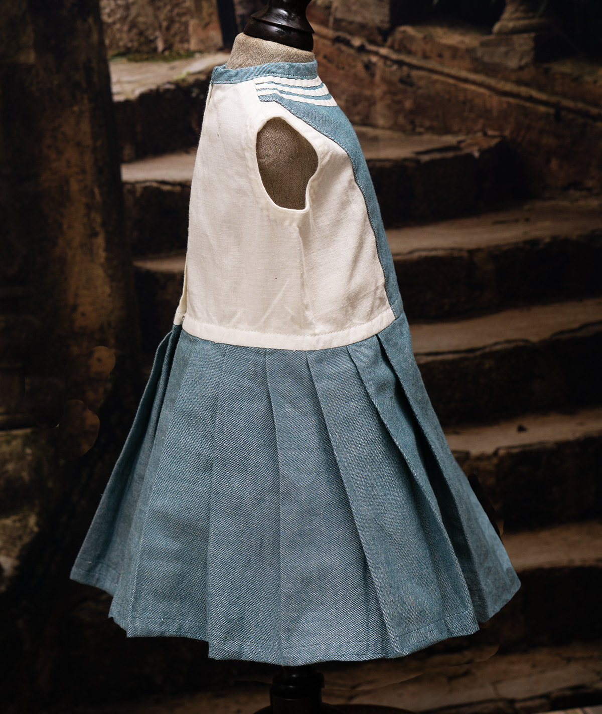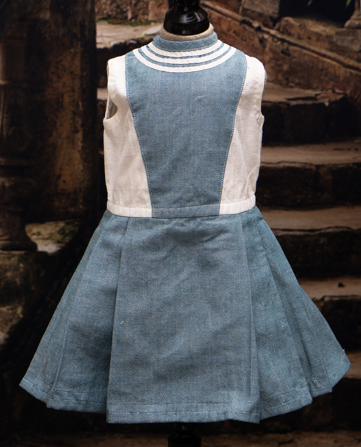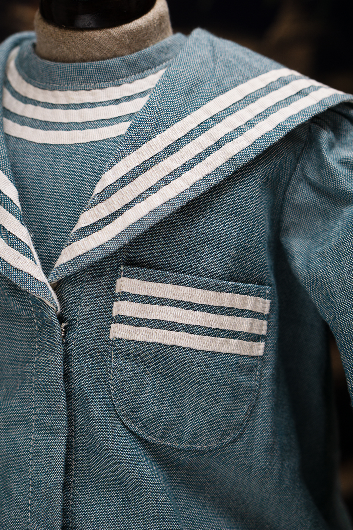 Of white and blue cotton, the three piece ensemble comprising sleeveless dress with pleated skirt, white pique hat, middle jacket with a very full sleeves with cuffs, wide sailor collar.