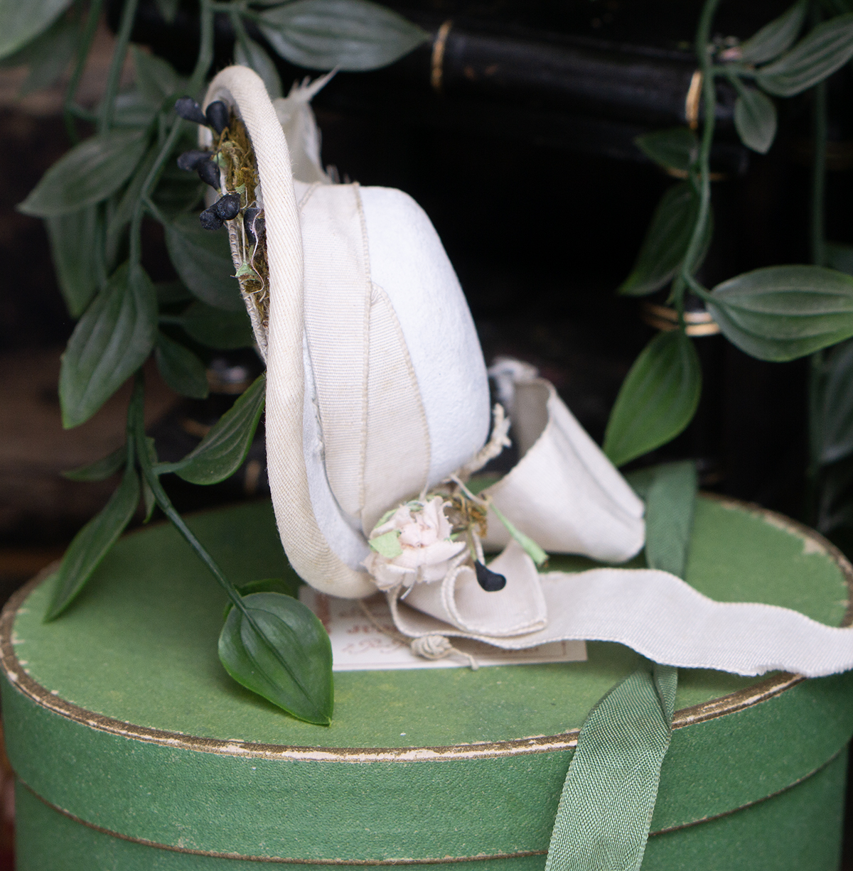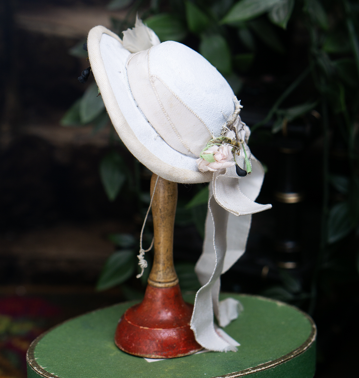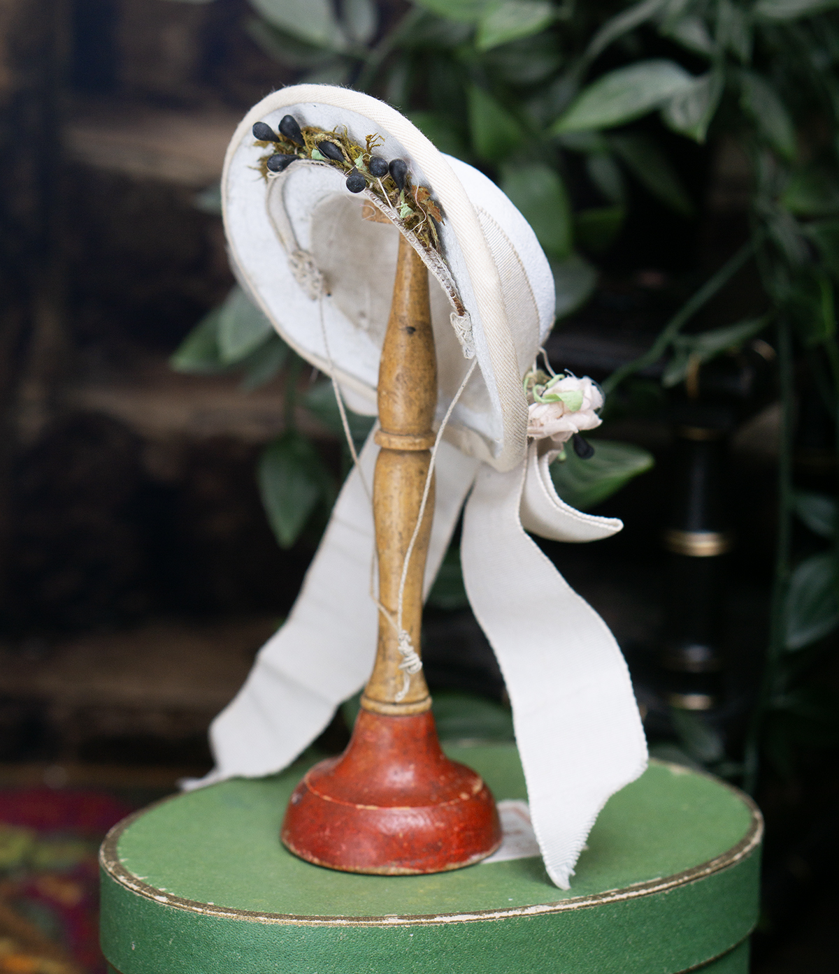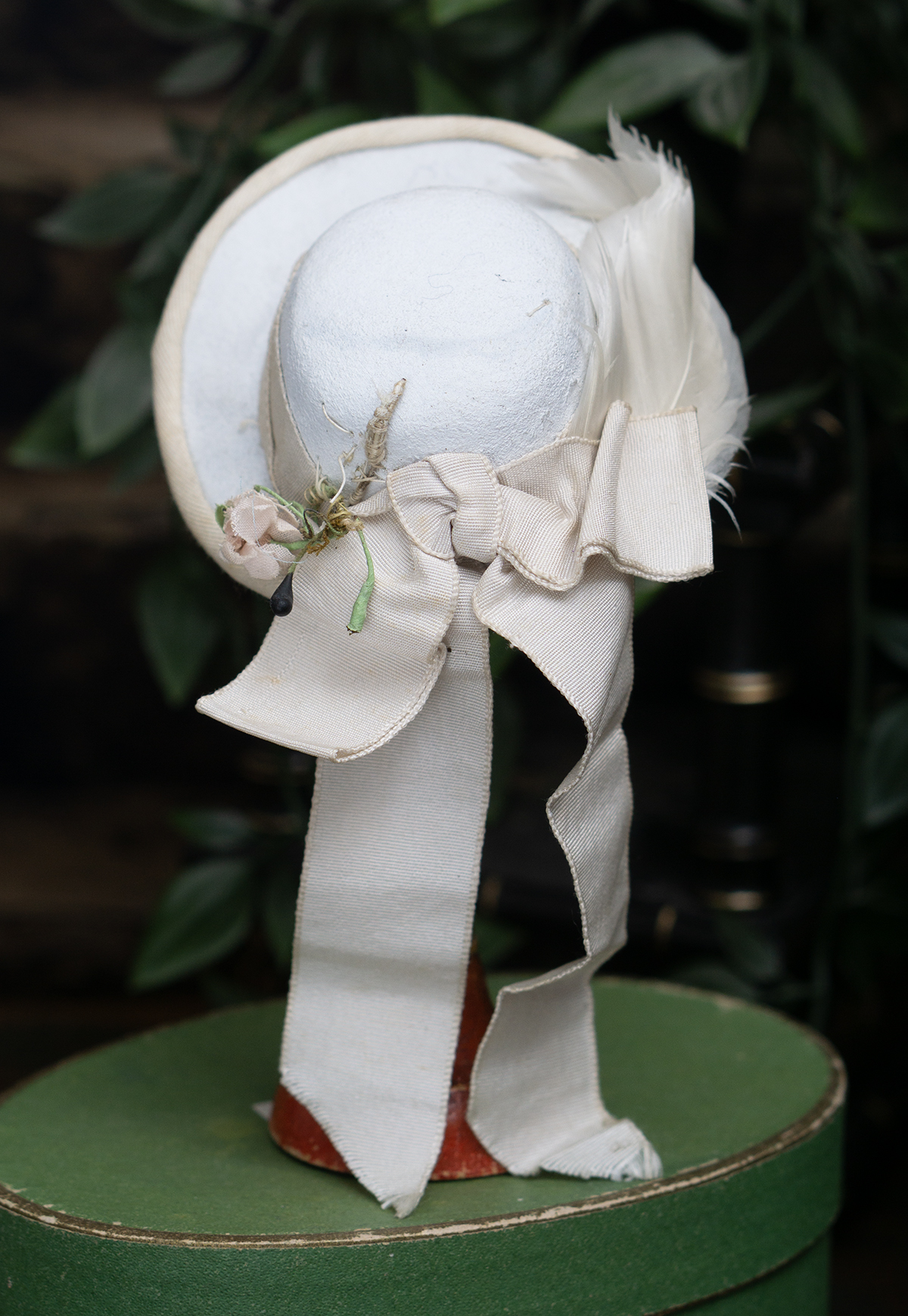 The hat in original green box with green silk handle. The box has original label by Judith Barbier, Paris. Excellent condition. This elegant hat designed for 15"-17" fashion doll. French, circa 1870. Measures: The hat 3 1/2 (9cm) height, 2" (5 cm) wide inside. The box 3 1/2 (9cm) height, 5 1/4" x 3 3/4" (13 cm x 9.5cm). International shipping cost 45 USD. ------------------------------------ I DO A LAYAWAY NO STATE SALES TAX! Thanks for your visit to Respectfulbear doll shop!