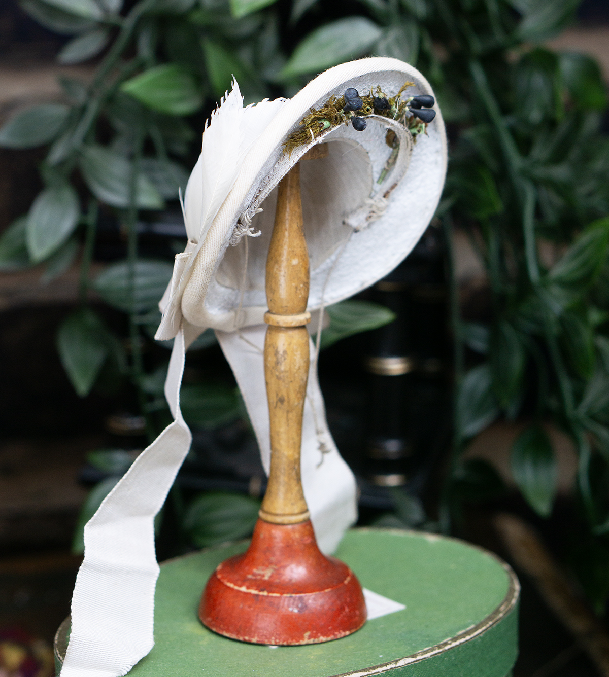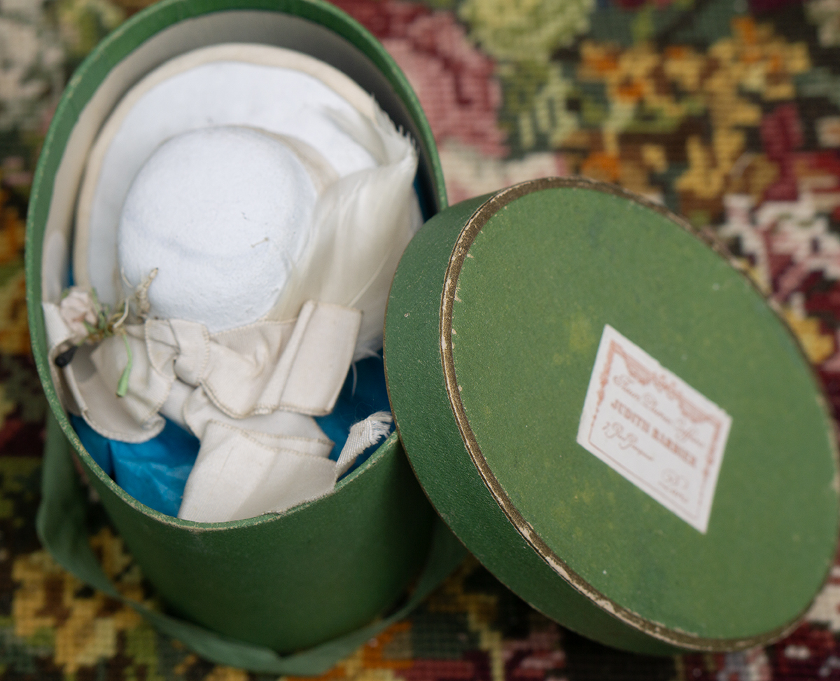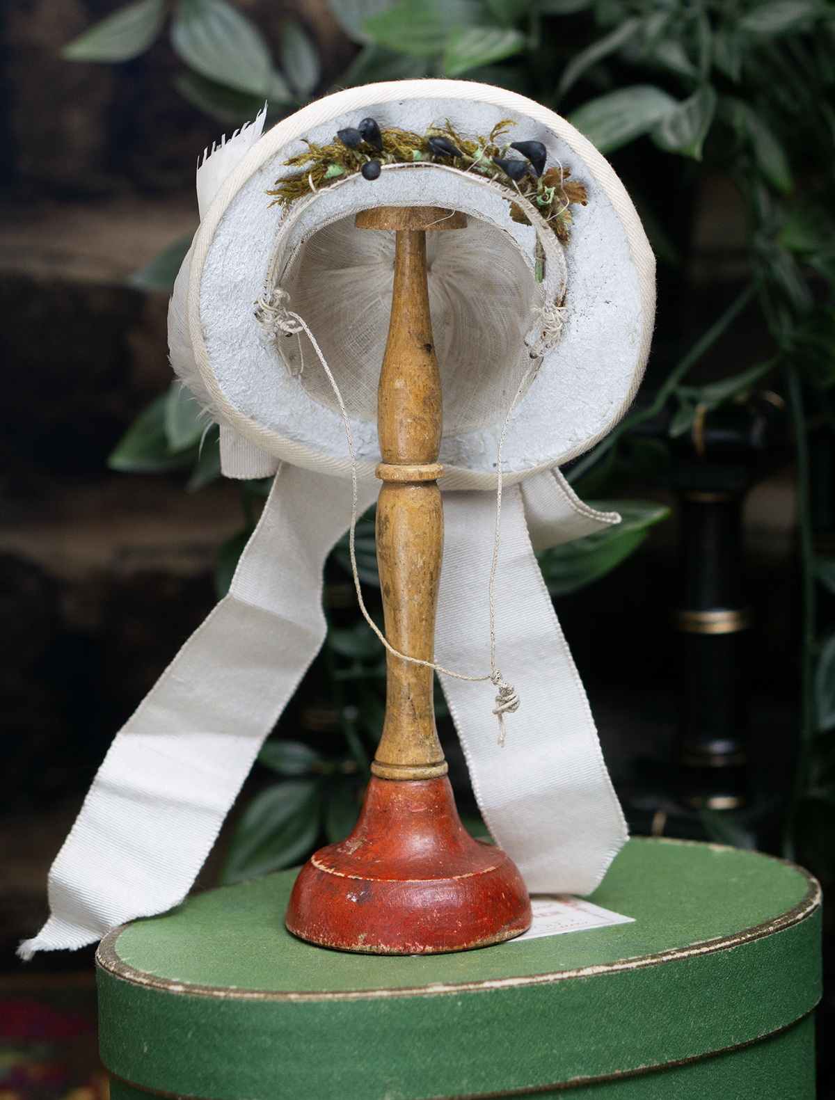 The hat in original green box with green silk handle. The box has original label by Judith Barbier, Paris. Excellent condition. This elegant hat designed for 15"-17" fashion doll. French, circa 1870. Measures: The hat 3 1/2 (9cm) height, 2" (5 cm) wide inside. The box 3 1/2 (9cm) height, 5 1/4" x 3 3/4" (13 cm x 9.5cm). International shipping cost 45 USD. ------------------------------------ I DO A LAYAWAY NO STATE SALES TAX! Thanks for your visit to Respectfulbear doll shop!
