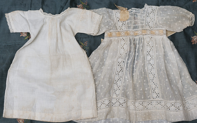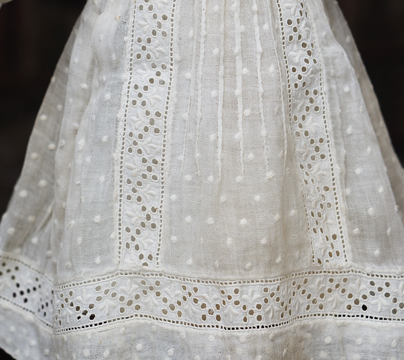 Very beautiful antique original dotted white batiste dress features set-in high waist with drawn-ribbon trim, very fill sleeves with lace edging, cotton cutwork insertions, tiny tucks, closure at the back with pearl buttons, decorated with large silk bow at the shoulder.