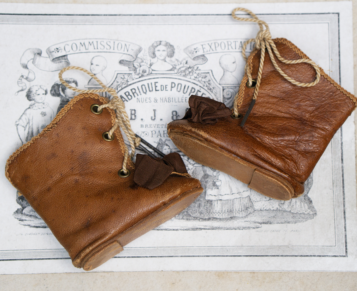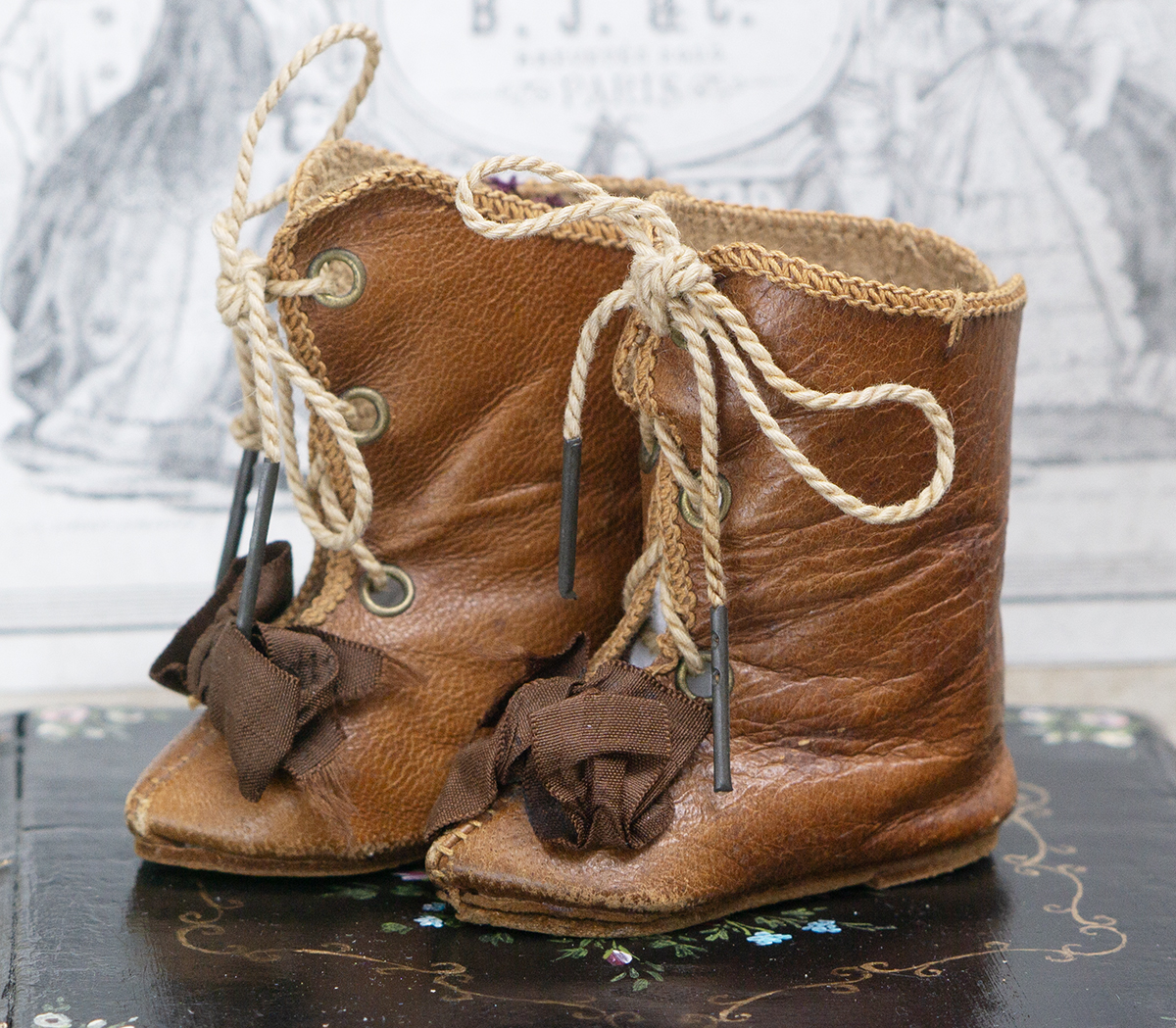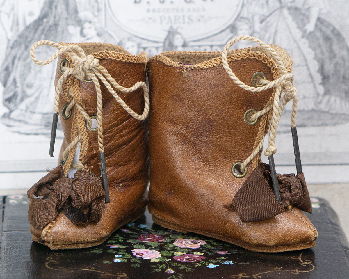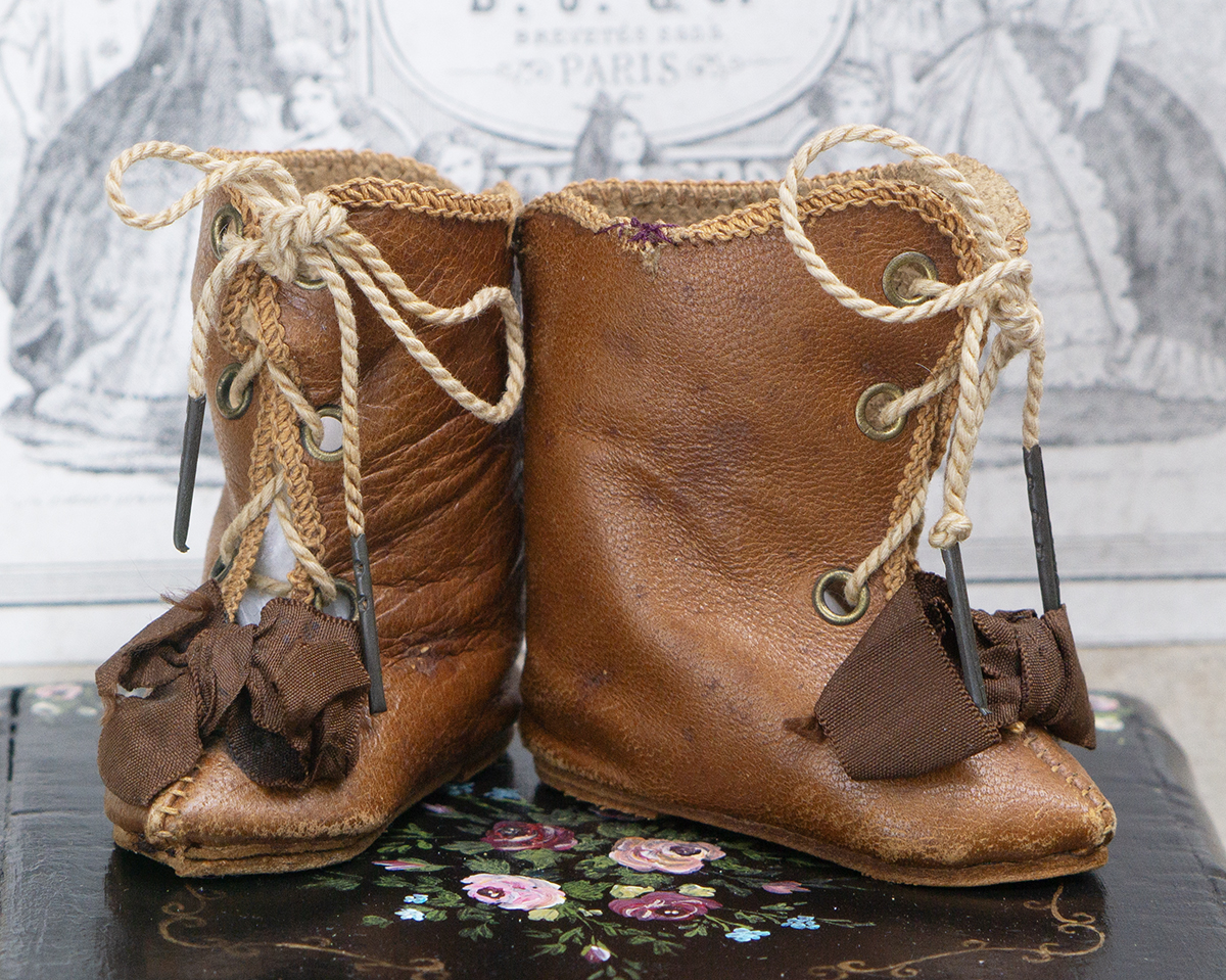 Brown leather original boots with highter-tan overcast stitching, 3 pairs of lacing grommets with cord ties, brown silk bows, tan soles impressed with "6".
